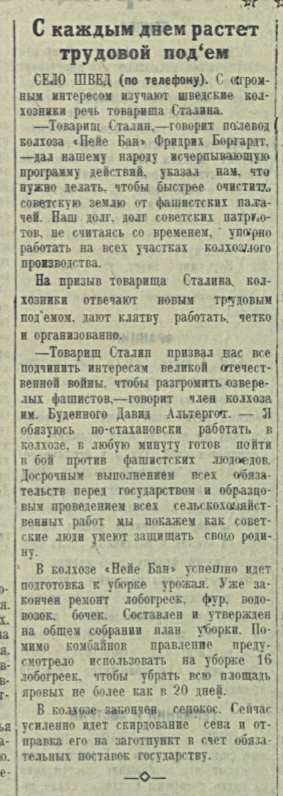 Мы, колхозники колхоза «Новый танные трудодни. По нашему расчету путь», села Швед Марксштадтского выходит, что распределим на трудодень кантона Немреспублики, находимся в по 5 кило зерновых. 886 гектаров ржu. Уборку пшеницы ков, имеющих 150-200 трудодней, окончим в 5 дней.