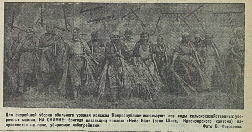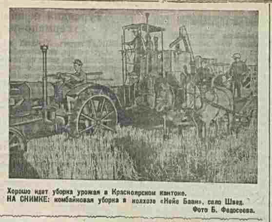 Крестьяне села Швед, Красноярского кантона, Республики немцев Поволжья, обратились с письмом к германскому крестьянству, в котором призывали германских крестьян помочь уничтожить фашизм, бороться за свою свободу и счастливую жизнь. Колхозники села Швед самоотверженной работой на полях помогают доблестной Красной Армии громить врага. На снимках: вверху - красный обоз колхозов села Швед "Нейе Баан" и имени Буденного с хлебом нового урожая для сдачи государству. Внизу (слева направо) - агитатор Генрих Боргард в обеденный перерыв читает колхозникам сообщение Советского Информбюро; Ирма Лореш, овладевшая специальностью комбайнера, за работой у штурвала; одна из электронасосных установок колхоза имени Буденного, орошающая 21 гектар огородов.