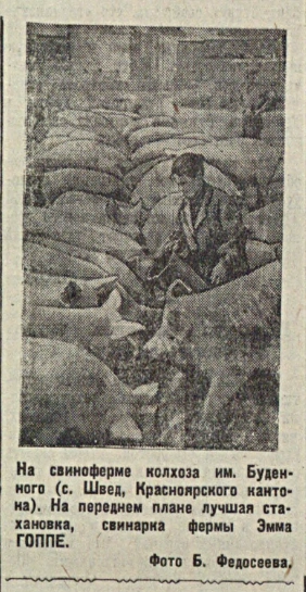 Мы, немецкие крестьяне Республики немцев Поволжья, в нынешнем году особенно усердно работаем на колхозных полях. Сев провели лучше, чем в прошлые годы, отчего урожайность в этом году будет гораздо выше. Мы получим хорошие результаты своего труда.